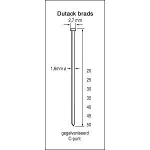 Bestemd voor gebruik in: Dutack tacker BT1650A (20 t/m 50mm) Dutack Pro tacker B1650Mg (20 t/m 50mm) Dutack Pro tacker B1664Mg (20 t/m 64mm) Dutack Electric accutacker B1650E (20 t/m 50mm) Dutack Electric accutacker B1664E (25 t/m 64mm)