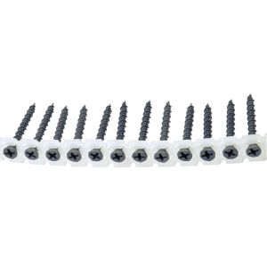 QZ Bandsnelbouwschroeven type Fermacell voor automatische verwerking van de juiste schroeven in Fermacell vloeren en wanden. Het dubbele schroefdraad (hoog/laag) heeft een geweldige grip in de Fermacell plaat en draait eenvoudig en vooral snel in. De professionele snelbouwschroeven zitten in een hoge kwaliteit kunststofband voor een storingsvrij resultaat, en zijn voorzien van een PH-2 aandrijving. Geschikt voor gebruik op alle gangbare merken bandschroefmachines / schroefautomaten. De schroeven hebben bovendien een 96 uur durende zoutsproeitest doorstaan waardoor jarenlange corrosiebestendigheid is gegarandeerd. De gefosfateerde schroef kan uitstekend worden afgewerkt met een wandafwerking product zoals stuc of latex muurverf.