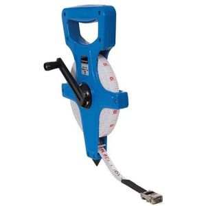 Landmeter met open spoel Slijtvaste landmeter met metrische en imperiale schaalverdeling. Sterk plastic frame met inklapbaar handvat. Metalen eindhaakjes en klauw. Water-, kras- en kreukbestendig, pvc gecoat blad. Klasse III nauwkeurigheid.