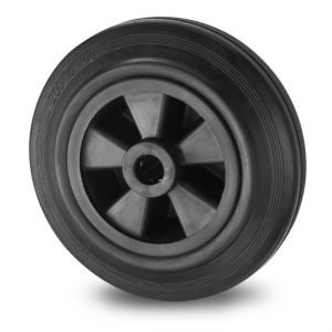 Ø 250mm, zwarte rubberband, 295KG zwarte rubberband, met wielkern uit polypropyleen, rollager, Voordelen: De massieve rubberbanden hebben een hardheid van 80 ° Shore A en bieden goede rijeigenschappen, rollen geruisloos, zijn stoot- en slagvast, corrosiebestendig en hebben een gemiddelde rolweerstand. Toepassingen: Industriële karren, material handling in fabrieken, afvalcontainers, transport-containers, metaal- en chemische bedrijven, rolcontainers voor middelzware belading, gereedschap-trolleys, magazijnkarren. Geschikte ondergrond: Vrijwel elke ondergrond: oneffen oppervlakken zoals klinkers, beschadigde vloeren en bij obstakels zoals drempels. De band kan zwarte sporen nalaten. Geschikte omgeving: Droog en niet permanent vochtig. Bij zwakke chemicaliën. Wiel diameter (mm) 250 Wiel breedte (mm) 60 Draagvermogen (kg) 295 Lager type Rollager Asgat-Ø (mm) 20 Naaf lengte (mm) 60 Hardheid van de band 80° Shore A Loopoppervlak Standaard zwarte massieve rubberband, uitermate geschikt voor toepassing onder transportkarren. Velgenmateriaal Polyamide 6 kern