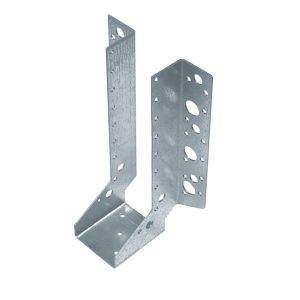 Balkdrager met zijflenzen, voor het bevestigen van dwarsbalken rechtstreeks tegen een muur of tegen een andere houten balk. Leverbaar voor de gangbare kopmaten geschaafd hout.