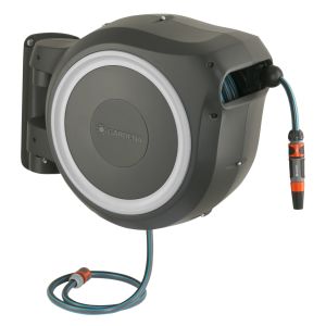 Dankzij het innovatieve ontwerp en de praktische oproltechnologie van de wandslangenbox RollUp M/L behoren omslachtig oprollen en geknikte slangen tijdens het bewateren tot het verleden. De wandslangenbox rolt de slang in een mum van tijd op en bergt de slang veilig en efficiënt op. De box wordt aan een muur bevestigd met een draaivoet van 180°. Deze beweegbare koppeling biedt maximale bewegingsvrijheid en een grote actieradius tijdens het bewateren. U kunt elke hoek van de tuin bereiken met de 25 meter lange kwaliteitsslang. De slang wordt moeiteloos afgerold door eraan te trekken en wordt automatisch op de gewenste lengte vergrendeld dankzij bijzonder korte vergrendelingspunten. Door voorzichtig te trekken komt de vergrendeling los en wordt de slang automatisch en betrouwbaar opgerold door een geïntegreerde veer. Om ervoor te zorgen dat de slang veilig en gecontroleerd wordt opgerold, maakt de wandslangenbox gebruik van innovatieve RollControl-technologie. De geïntegreerde slanggeleider zorgt ervoor dat de slang netjes en gelijkmatig wordt opgerold, zodat er geen knikken of knopen in de slang komen. De muurbeugel biedt ruimte aan diverse bewaterhulpstukken, die daar kunnen worden opgeborgen zodat de slangaccessoires altijd bij de hand zijn. Het hoogwaardige materiaal is bestand tegen UV en vorst. De slang wordt beschermd met diefstalbeveiliging, zodat deze altijd veilig is. Behalve de wandslangenbox bevat de box een muurbeugel, een aansluitslang, alle benodigde Original GARDENA System onderdelen en montageonderdelen en een mondstuk met twee verschillende sproeiopties. GARDENA geeft vijf jaar garantie op de wandslangenbox RollUp M/L.
