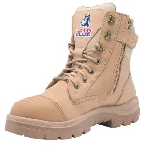 De Steel Blue Southern Cross Zip Sand S3 is een hoge S3-werkschoen met rits- en vetersluiting. Gemaakt van waterafstotend volnerf buffelleder (nubuckleer). De schoen heeft een stalen neus, antiperforatiezool en antislipzool. De zool is hittebestendig tot 130 °C en antistatisch.