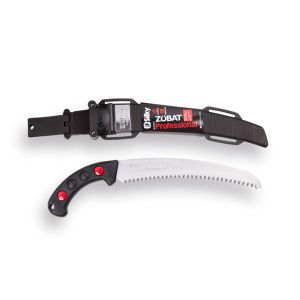 Silky vaste gebogen snoeizaag Zubat 240-7,5 incl. holster. (SILKY artikelnummer KSI327024) Bladlengte: 240 mm Vertanding: grof (7.5 tanden per 30 mm) Het gebogen blad van de Zübat snoeizaag is nikkel gecoat en voorzien van Silky's unieke Mirai-Me vertanding. Deze laser uitgesneden tanden, met een kerf van 1.4 mm., zagen snel en eenvoudig vers hout. Voor het zagen tussen de knie en tot schouderhoogte wordt een recht zaagblad (Type Gomtaro) geadviseerd, voor het zagen onder de knie en vanaf schouderhoogte wordt een gebogen zaagblad (Type Zübat) geadviseerd. De rubberen handgreep ligt comfortabel en vast in de hand en absorbeert trillingen. De Zübat snoeizaag is in meerdere lengtes leverbaar. Alle zagen uit de Zübat serie zijn voorzien van een lichtgewicht, polypropyleen holster met afneembare riemhouder. Het holster is zo ontworpen dat de zaag er in geen mogelijkheid uit valt. Maar de zaag trekt u tegelijkertijd in één beweging uit het holster. De twee rolletjes in het holster voorkomen dat de scherpe tanden de hoes beschadigen en onderkant is voorzien van een grote opening voor het verwijderen van vocht en zaagsel. Het zaagblad maakt u het beste schoon met olijfolie. Hars lost op in olijfolie en dit is dan ook een effectieve en milieuvriendelijke manier om het blad te reinigen en de zaagcapaciteit te behouden. Schuif de meegeleverde hoes over het gereinigde zaagblad en bewaar de zaag op een droge plaats. Tip: Zorg voor de nabijheid van een reserve zaagblad (art.nr. 1542825), zodat u altijd gemakkelijk door kan blijven zagen. De naam Zübat komt voort uit het geluid dat een Samurai zwaard maakt wanneer deze zijn doel raakt. Silky wordt geproduceerd in Japan sinds 1919 uit hoogwaardig SK-4 Carbonmetaal.
